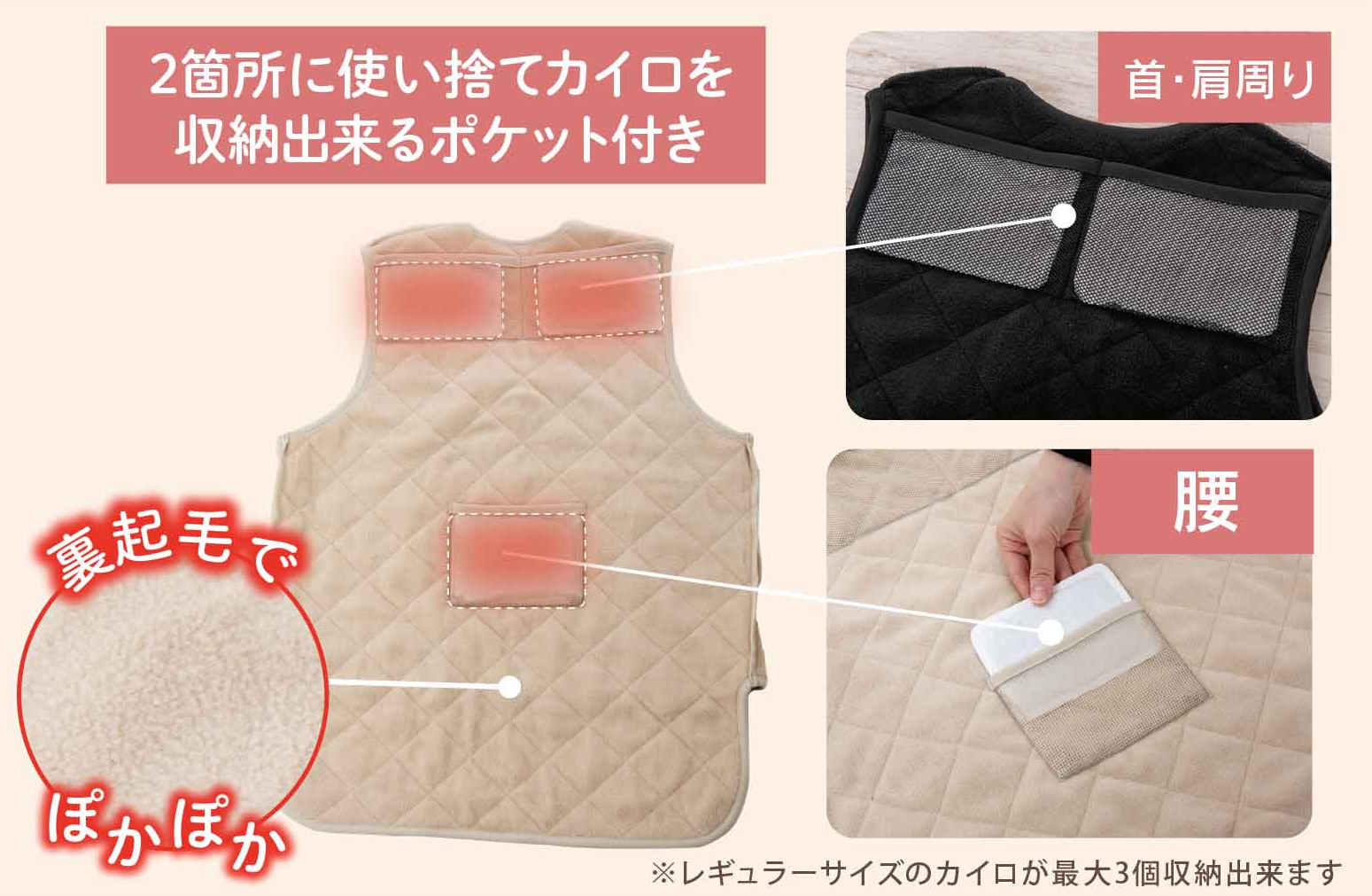2箇所に使い捨てカイロを収納出来るポケット付き