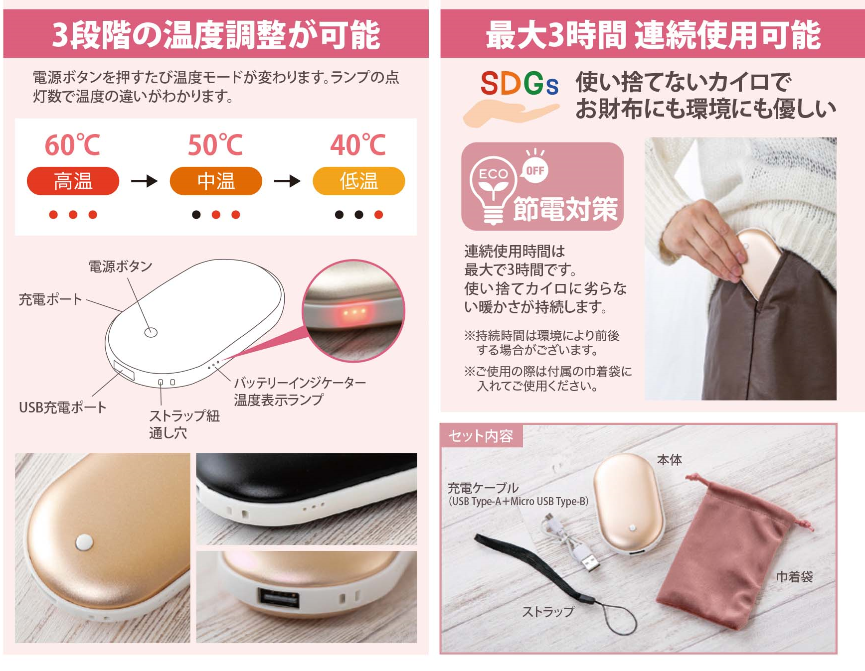 連続使用時間は最大で3時間と使い捨てカイロに劣らない持続性です。
