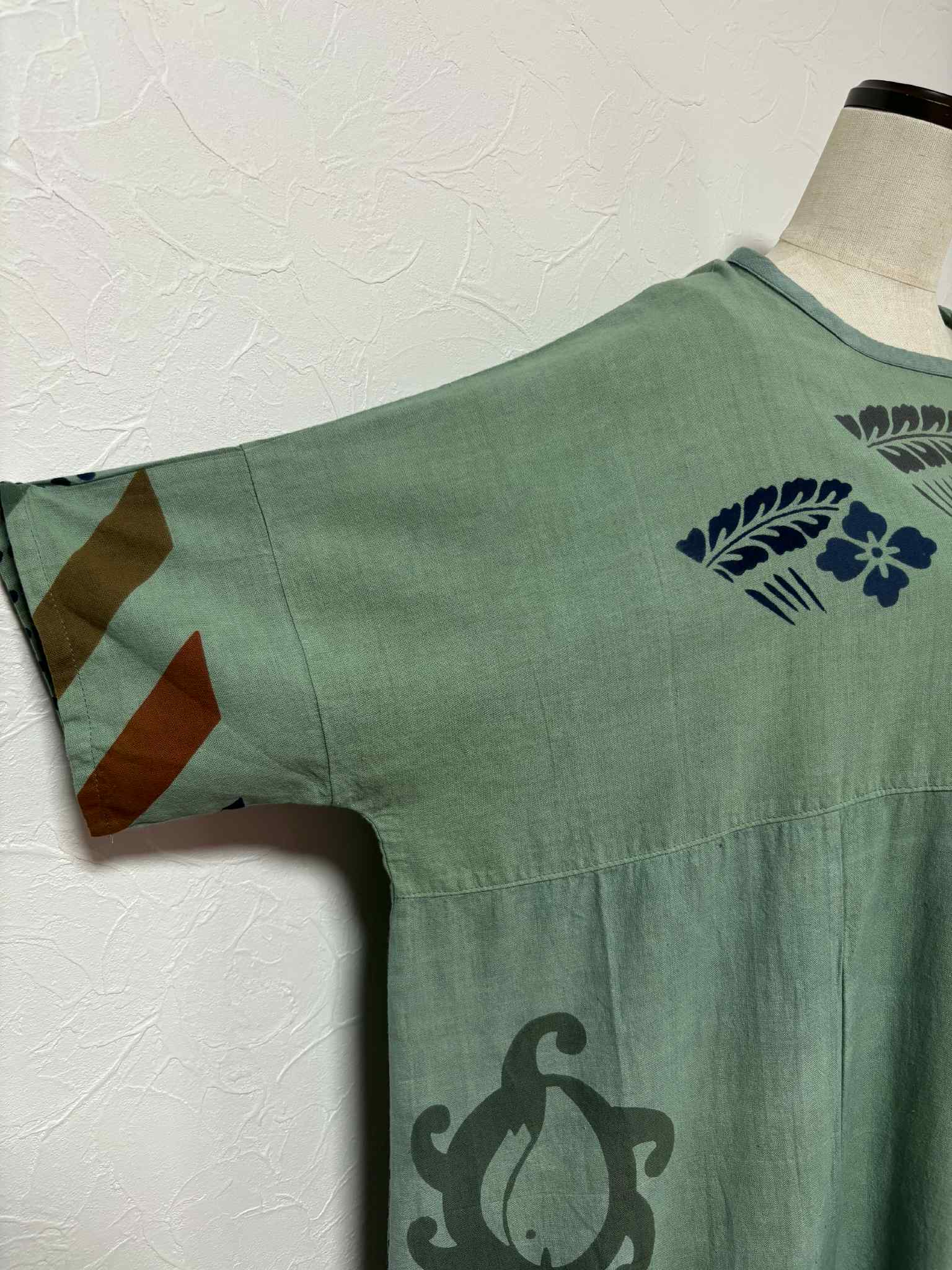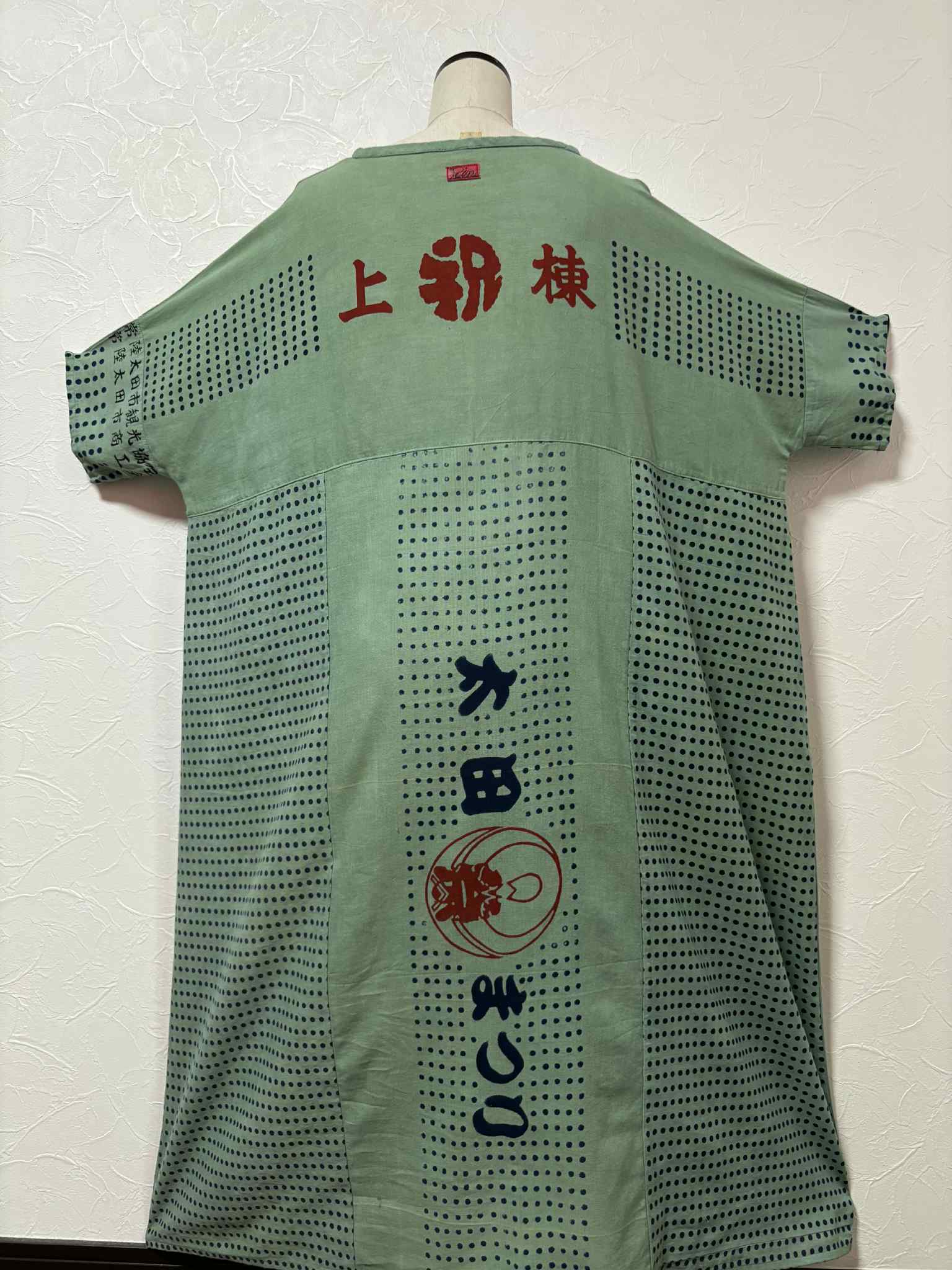 商品説明 1)レトロな手ぬぐいを縫い合わせたワンピースになります。 2)タップリとしたデザインでMサイズからLLサイズの方まで着用出来ます。 ※柔らかい素材の為 Mサイズの方でも体の線に沿ったスッキリデザインになります。 3)一点づつ手染めで染め上げております。 4)薄い緑色 ④素材 綿100% ⑤サイズ 身幅76㎝ 着丈117㎝ ⑥お手入れ方法 自宅でのお洗濯が可能です。 色落ちがしますので他の 衣服とのお洗濯はお控え下さい。