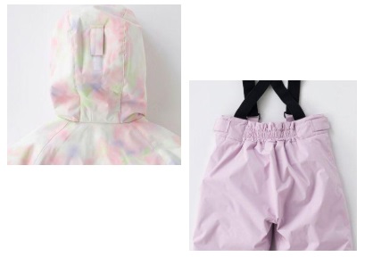 タイダイ柄のスノーウェア上下セット。カラフルなプリントで雪の中でも可愛い。サスペンダー付きなので、アクティブに動いても風が入りにくいデザインです