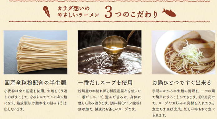 食物繊維豊富な全粒粉入りの熟成半生麺を化学調味料不使用のスープで召し上がる、お鍋ひとつで簡単に調理ができる家庭用ラーメン。