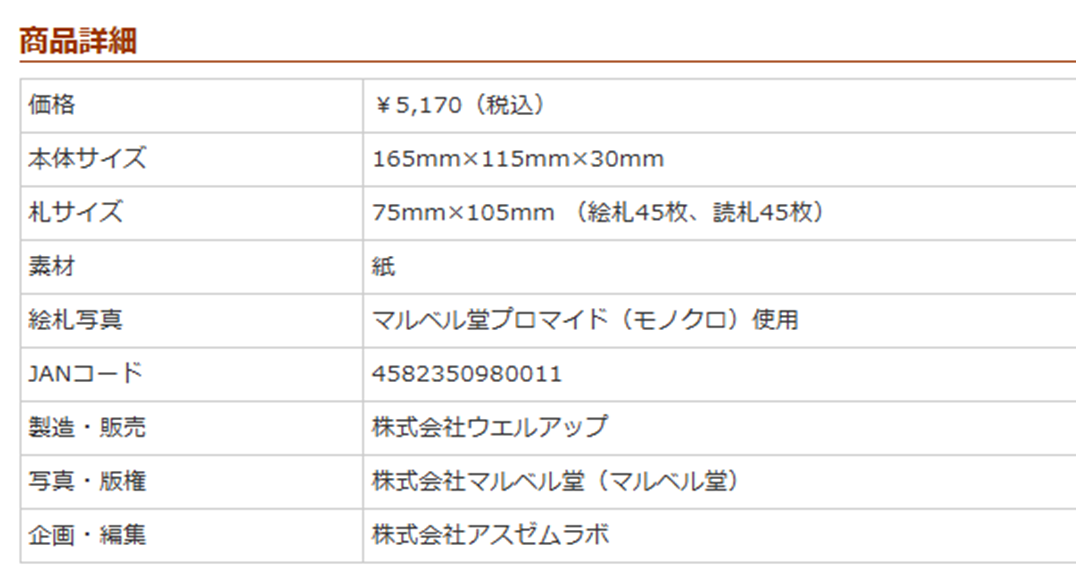 | サイズ | 本体サイズ:165mm×115mm×30mm 札サイズ:75mm×105mm (絵札45枚、読札45枚) |