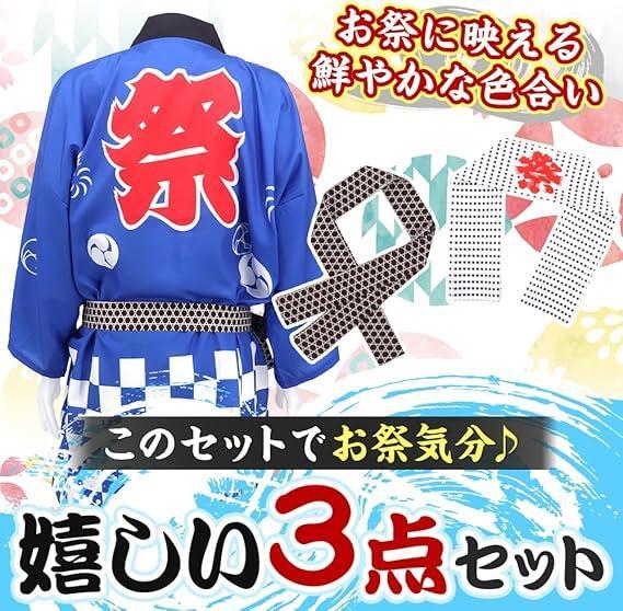 【セット内容】法被、帯、手拭いの3点セットで揃える手間が省ける。