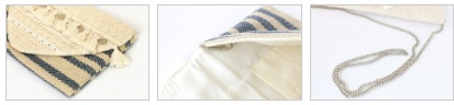 タッセルとデザインボタンが目を惹くクラッチバッグ。ブルーのボーダー柄が爽やかです。