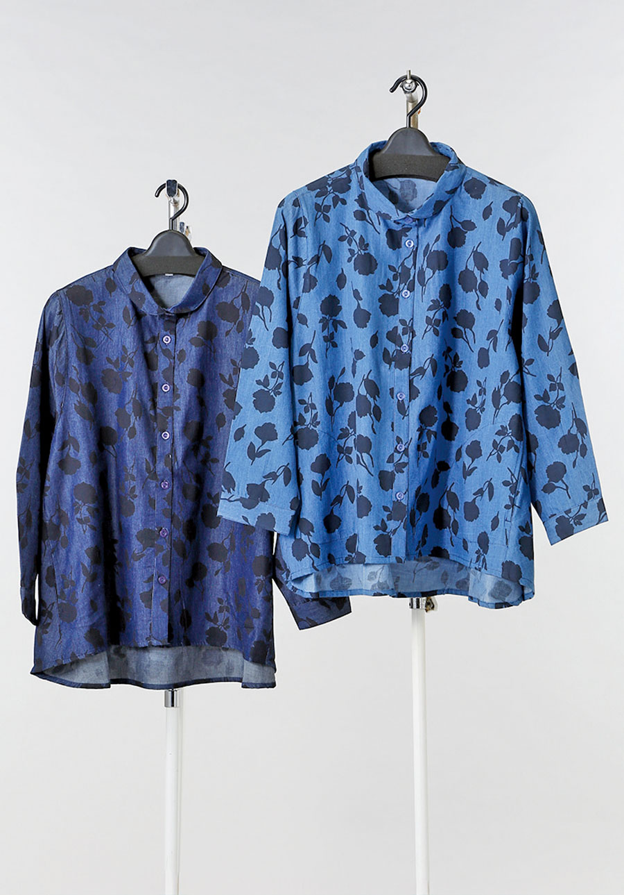② 長袖デニム 襟付きプリントシャツ