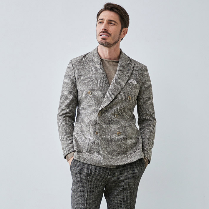 クラシックなダブルブレストに、シャープで存在感のあるピークドラペルを採用し、大人の品格を引き立てるデザイン。伝統的なグレンチェック柄がコーディネートを格上げし、ビジネスからカジュアルまで幅広く活躍します。