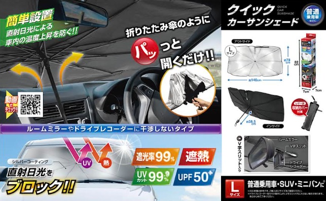 折りたたみ傘のようにパッと開くだけで簡単設置!ドライブレコーダー装着車におすすめのV字スリット入りカーサンシェードです。