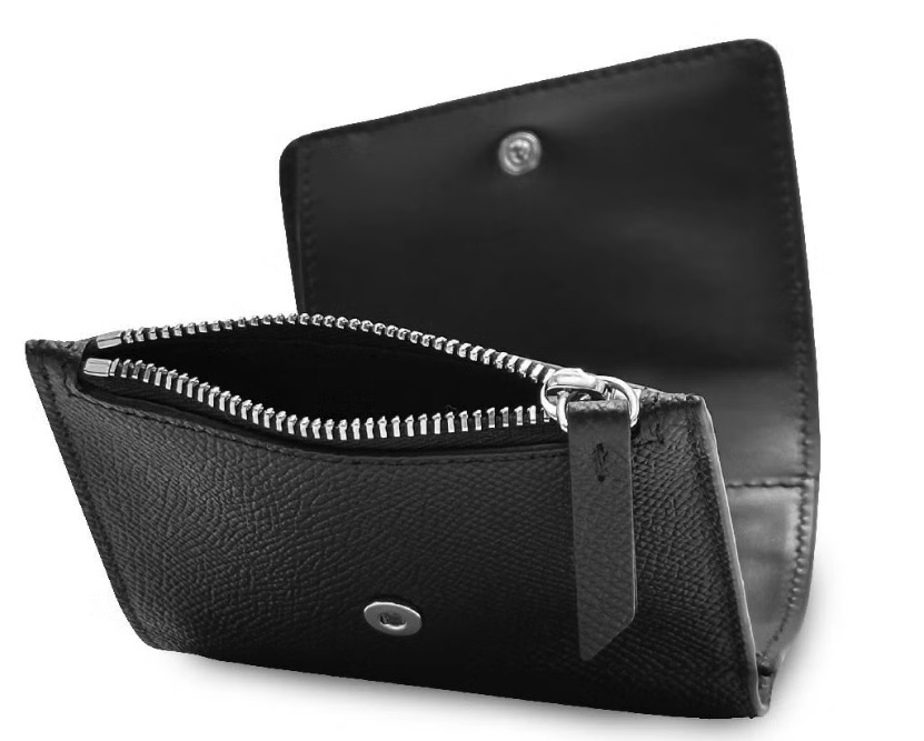 仕様:スナップ開閉式、 カード入4、 紙幣入1、 ポケット3、 小銭入1(ファスナー)